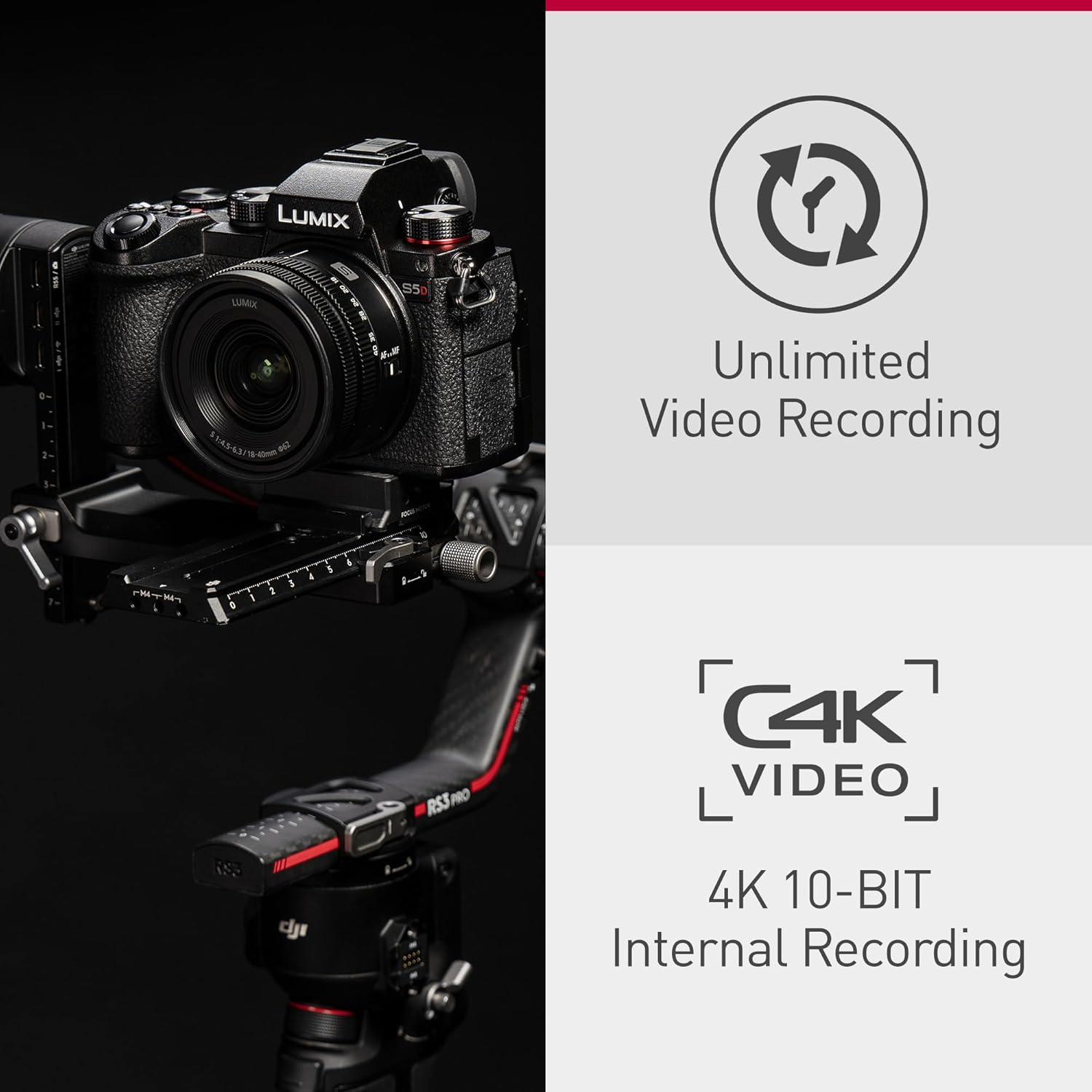 Recording modes include 4K 60p/50p* 4:2:0 10-bit and C4K/4K 30p/25p 4:2:2 10-bit - plus 4K 8-bit with no limitation of video recording time. In the 10-bit setting, 4:2:2 10-bit HDMI output is supported along with simultaneous external drive / SD card recording.**