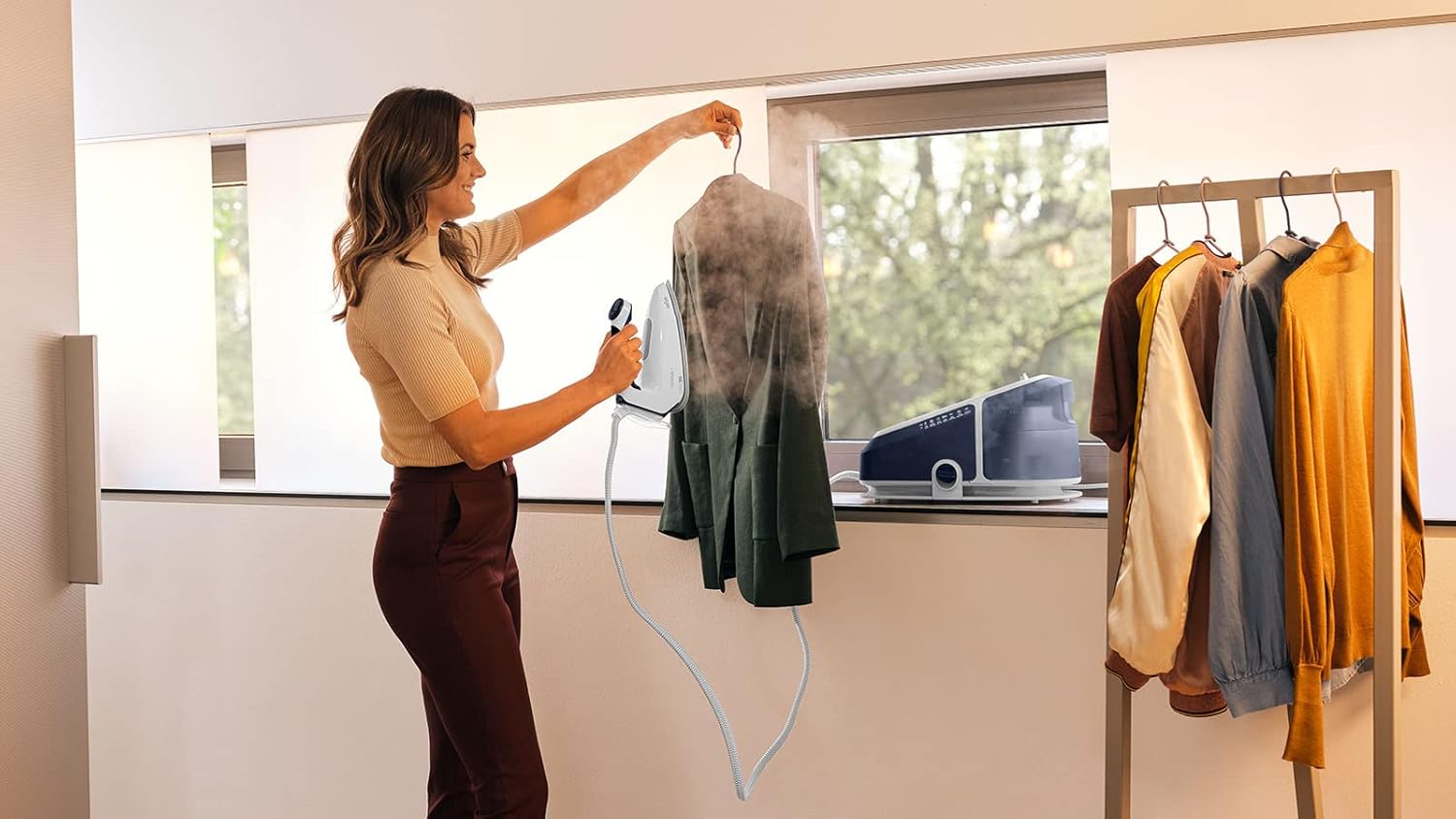 VERTICAL IRONING: its powerful continuous steam makes vertical steaming of curtains and hanging clothes really easy