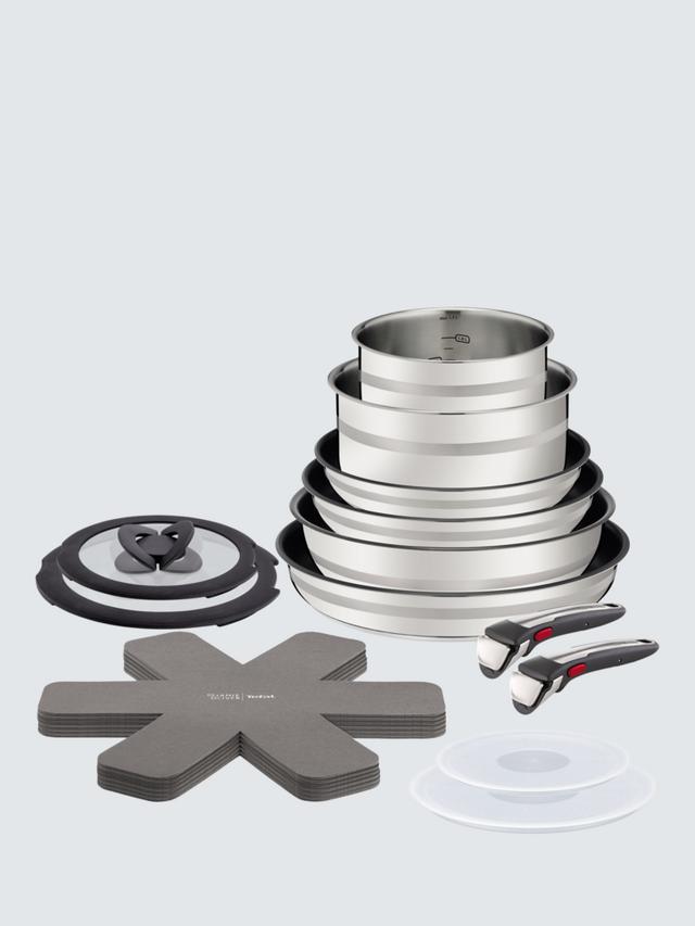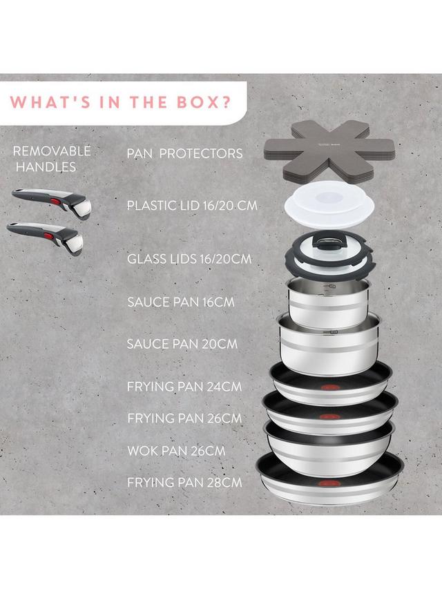 An 18-piece Tefal cookware set including three frying saucepans, two saucepans and a wok in key sizes from the stainless steel Tefal Ingenio range. The set comes with two hermetic plastic lids and two Ingenio removable handles for use with each pan and other Ingenio cookware. The saucepans feature interior capacity markings to help you cook the right quantities when following recipes. The frying pans and wok have a non-stick surface. The pans stack together, giving you more cupboard space. The Ingenio range includes stackable pan accessories from straining lids to spare handles.