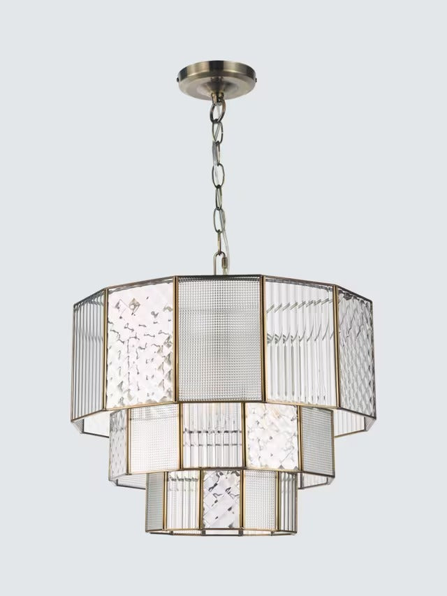 John Lewis Rhea Textured Glass Tiered Dimmable Ceiling Light - Antique Brass - Grade A is backordered and will ship as soon as it is back in stock.