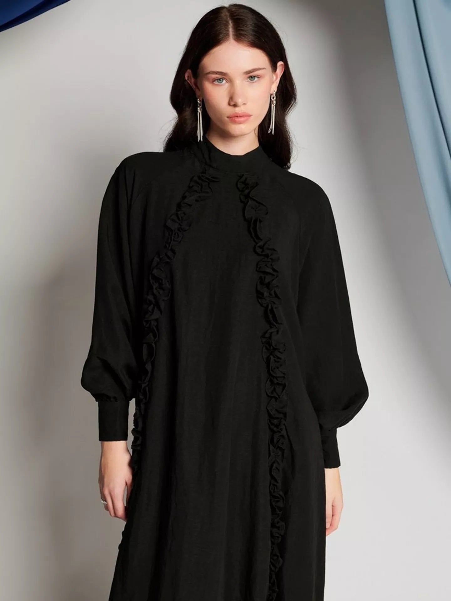 An oversized midi dress in a soft woven fabric. Featuring statement double edged ruffles in bodice seams. Detailed with long voluminous sleeves with a fitted cuff and fastened with a concealed zipper at the back.